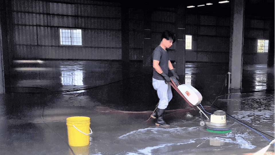地板油污處理:專業三部曲1.高壓沖刷:先以高壓水柱沖走表層鬆動的污泥、沙塵。2.噴灑專用除油靈或重油污清潔劑,等待藥劑分解油脂。配合洗地機(圓盤刷)強力刷洗,將滲透進地坪孔隙的油垢刷出。3.二次沖洗與回收:再次使用高壓水柱沖刷污水,並同步以吸水機將污水吸除,避免油垢殘留導致地板濕滑或乾燥後出現腳印。這套「由上往下」結合「高壓除油」的方法是目前業界公認最有效率的標準做法。
